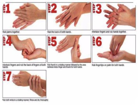 Hand washing with hand rub is common practice in healthcare set-up. Washing hands with soap and water is common and effective way of avoiding and preventing disease transmission, in the community. Germs are microscopic and can’t be seen by naked eyes. Germs like bacteria and viruses are found everywhere, including our routine use articles like cell phones, computers, desktops, doors, bench, almost everywhere. They can be transmitted to hands when we touch them & from hand they can enter into our mouth or eyes when we touch these areas. Germs don’t go away with routine wash with water because they tend to hide in the finger web and nail beds which are difficult to reach with routine hand wash so hands should be washed with seven step method. Method of handwashing: First Apply enough soap to cover all the surfaces of the hand.