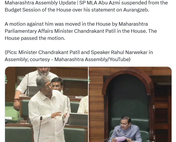 Samajwadi Party Leader Abu Azmi is suspended from the Maharashtra Assembly till the budget session concludes. He is being suspended for praising Mughal ruler Aurangzeb. The proposal to suspend him was moved onto the table by Parliamentary Affairs Minister Chandrakant Patil on March 5.