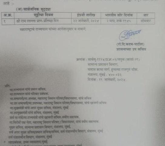 The Maharashtra Government has officially declared January 22 as a public holiday to commemorate the inauguration of the Ram ...