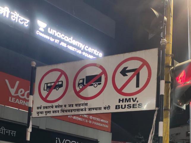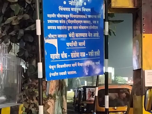 The Chinchwad bridge was closed by the traffic department for heavy vehicles including PMPML buses from Mahavir Chowk towards Chinchwad Gaon and a height barrier was placed on the entrance of the bridge to avoid heavy vehicles to avoid traffic congestion. The heavy vehicles were directed to use an alternate route from Mahavir Chowk to Khandoba Mal towards Bhakti Shakti.