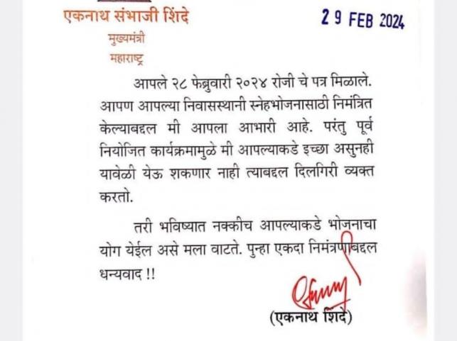 Similarly, Cm Eknath Shinde also sent a letter that he will not be able to attend the dinner party, "Received your letter dated 28 February 2024. I thank you for inviting me for lunch at your residence. But due to pre-scheduled events, I apologize for not being able to come this time even if I wanted to. However, I think we will definitely have food yoga in the future. Thanks again for the"