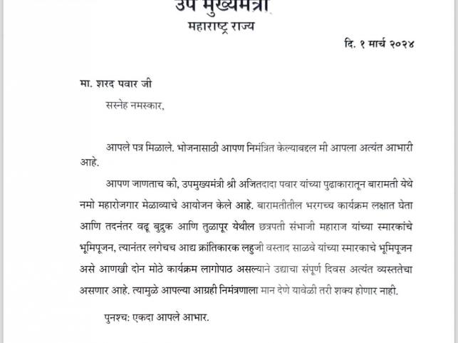 Deputy CM wrote a letter to Sharad Pawar which says, Received your letter. I am very grateful to you for inviting me for dinner. As you know, on the initiative of Deputy Chief Minister Shri Ajitdada Pawar, Namo Maharojgar Mela has been organized at Baramati. The whole day tomorrow is going to be very busy considering the huge program in Baramati followed by Bhoomipujan of the memorials of Vadhu Budruk and Chhatrapati Sambhaji Maharaj in Tulapur, followed immediately by the Bhoomipujan of the memorial of early revolutionary Lahuji Raghoji Salve. Therefore, it will not be possible to honor your insistence at this time.