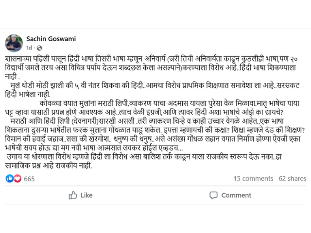 For instance, should we say Ityatta (Marathi for class) or Kaksha (Hindi)? Does Shiksha mean education or punishment? Is it Vimaan or Hawaai Jahaz for airplane? Sasa or Khargosh for rabbit? Dhanushya or Dhanush for bow? There are countless such confusions that may arise at a young age. It’s better to let children get accustomed to one language first — they will absorb the next one more easily later. Don’t give a childish political spin by equating opposition to this policy as opposition to Hindi. This is a social issue, not a political one. In such strong words, renowned writer Sachin Goswami also criticized the government.