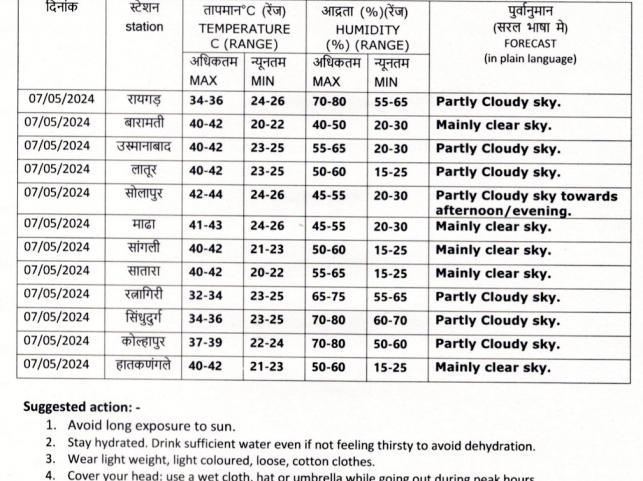 On the other hand, clear skies are expected for Baramati, Mahad, Sangli, Satara, and Hatkanangale, with maximum temperatures between 40 and 42 degrees Celsius. Humidity levels in these areas are expected to be between 40% and 65%. In Sholapur, the temperature could reach between 42 and 44 degrees Celsius, with partly cloudy skies developing in the afternoon. Given this information, those in Sholapur should prepare for a hot day with possible cloud cover later on, providing some respite from the heat.