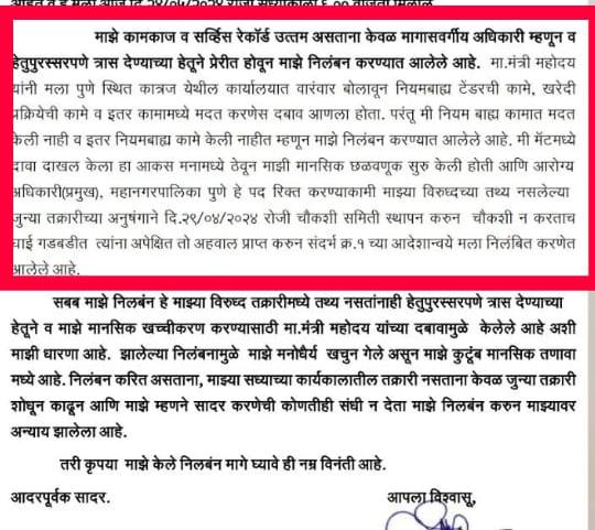 Dr. Pawar alleged that his suspension is driven by discriminatory motives, citing his status as a backward class officer and the intent to harass him. He claimed that the minister repeatedly summoned him to the Katraj office to pressure him into approving irregular tenders and procurement processes, which he resisted. "I was mentally harassed for not yielding to the minister's demands," he stated. He also mentiones that he faced mental harassment for filing a claim in the Maharashtra Administrative Tribunal (MAT) against his transfer.