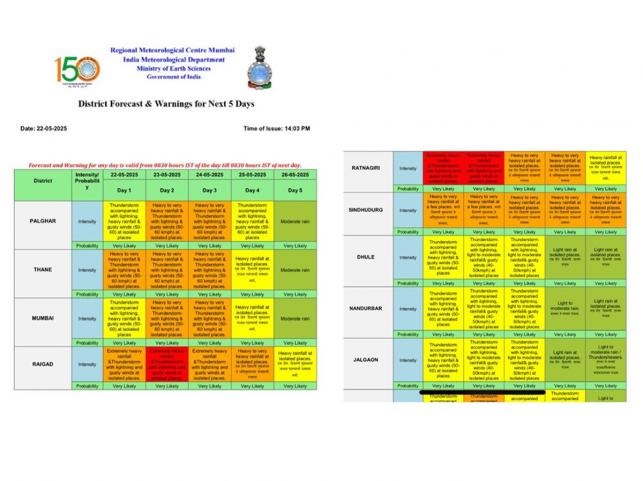 The India Meteorological Department (IMD) has issued an alert for a number of Maharashtra districts, predicting severe weather conditions for the next five days beginning Thursday, May 22, 2025, including thunderstorms, lightning, gusty winds, and heavy to extremely heavy rainfall. Districts like Raigad, Ratnagiri, and Palghar are expected to see exceptionally heavy rainfall and strong gusts of 50–60 kmph, per the IMD bulletin issued at 2:03 PM. Mumbai, Thane, and Palghar are under an orange alert for severe to very heavy rainfall on May 23 and 24. A red alert for May 23 has been issued for the Raigad and Ratnagiri districts, signifying a strong likelihood of extremely heavy rains and severe weather. Heavy to very heavy rainfall and thunderstorms with lightning are predicted to persist through May 26 in various areas, including Mumbai, Thane, Pune, Nasik, and Sindhudurg.