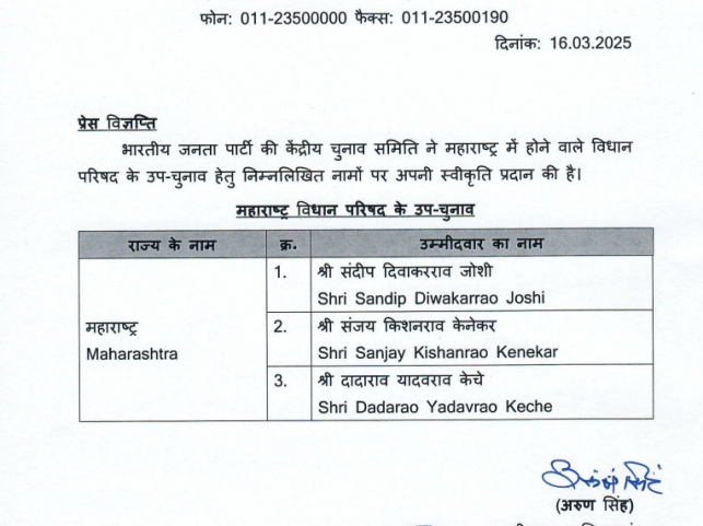 After receiving approval from the Central Election Committee (CEC), the Bharatiya Janata Party (BJP) on March 16 released the names of three candidates for the next Maharashtra Legislative Council by-elections.