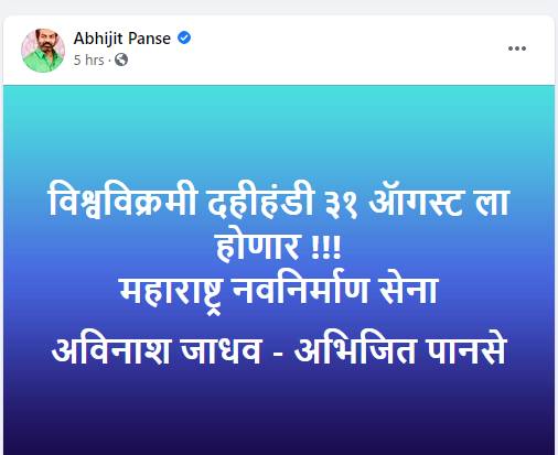 Due to the Coronavirus crisis, all festivals and celebrations in Maharashtra have been banned since last year. Dahihandi was also not celebrated due to covid last year. But this time, Maharashtra Navnirman Sena seems determined to celebrate Dahihandi in any case. Because MNS leader Abhijit Panse has announced this on his Facebook page. Abhijit Panse has said in the post that he will celebrate the world record Dahihandi on 31st August. He has also mentioned the name of Thane district president Avinash Jadhav.