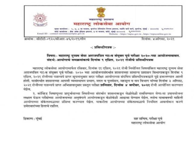 The Maharashtra Public Service Commission examination scheduled for April 11, 2021 was postponed by the state government on April 9. Now the Maharashtra Public Service Commission has decided to conduct this examination on September 4, 2021. The Commission has informed the candidateds about this by issuing a circular. The state government had sent a letter to the Maharashtra Public Service Commission on August 3, 2021 informing them of their views.