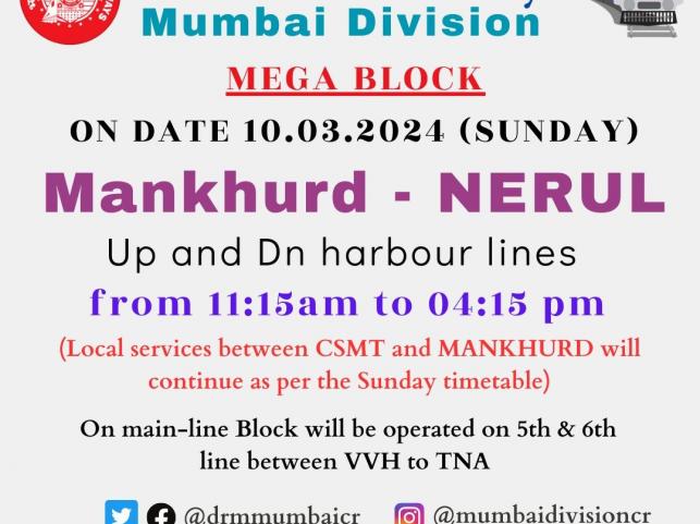 - Schedule: Trains on both UP and DOWN Harbour lines between Mankhurd and Nerul stations will be halted from 11:15 AM to 4:15 PM.