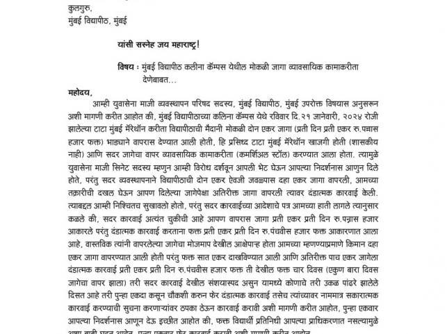 Mumbai University asked the management of Tata Mumbai Marathon to pay the penalty. The order mentioned that for the additional 5 acres of land used for organising the sports expo and Tata Mumbai Marathon at the open space in the Kalina campus of Mumbai University, the organisers need to pay a total of Rs. 5,00,000/- at the rate of Rs. 25,000/- per acre per day + 18% GST for 4 days from January 17 to 20, 2024. The said amount should be deposited in the Finance and Accounts Department of the University immediately.