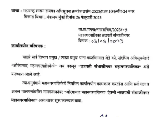 The municipal corporation has now also been renamed Chhatrapati Sambhajinagar Municipal Corporation after the central government approved the renaming of Aurangabad city. Municipality Administrator and Commissioner Dr Abhijeet Chaudari have issued a circular in this regard today. So now instructions have been made to use Chhatrapati Sambhajinagar on the nameplates as well.