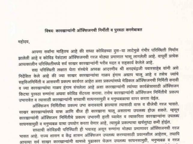 The Vasantdada Sugar Institute has appealed to the sugar factories in the state to produce oxygen. Vasantdada Sugar Institute has written a letter to the sugar factories. Letters have been sent to 190 co-operative and private factories in the state. In addition, it has been appealed that the factories which are closed should purchase oxygen kits and supply them to the hospitals. Letters have been sent to the sugar factories as per the instructions of Sharad Pawar.