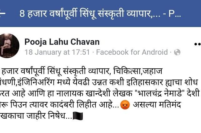 Pooja had said in her post that historians are exploring how the Indus Valley Civilization was so advanced in trade, medicine, shipbuilding and engineering eight thousand years ago. However, Khandeshi writer "Bhalchandra Nemade" is drinking local liquor and writing novels on it." Pooja Chavan shared this post on Facebook on the evening of January 18.