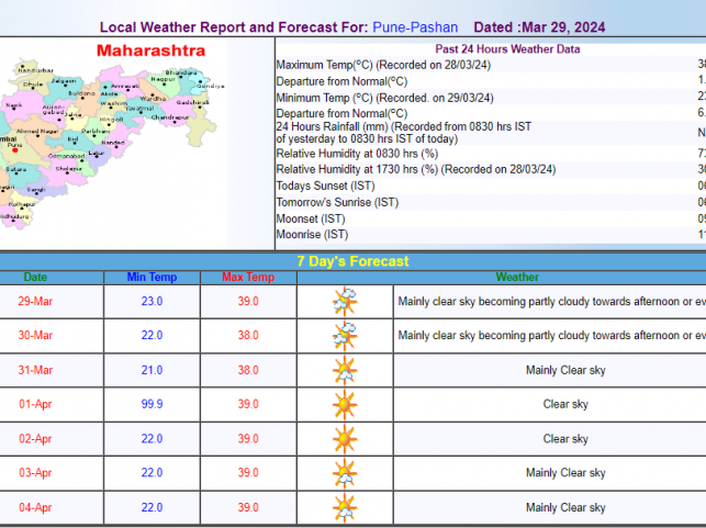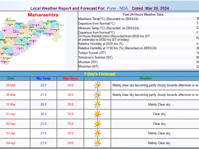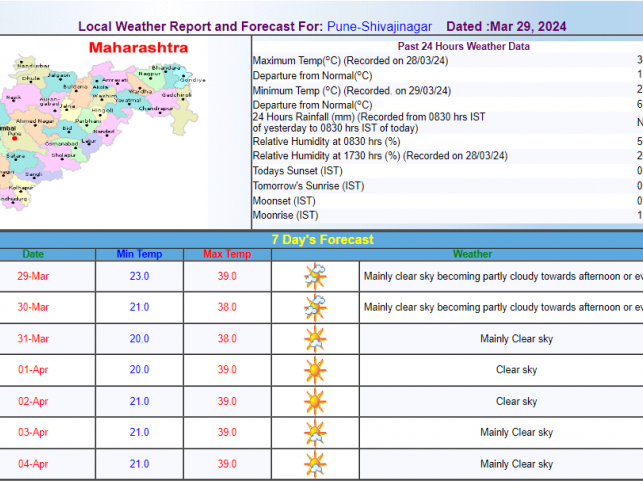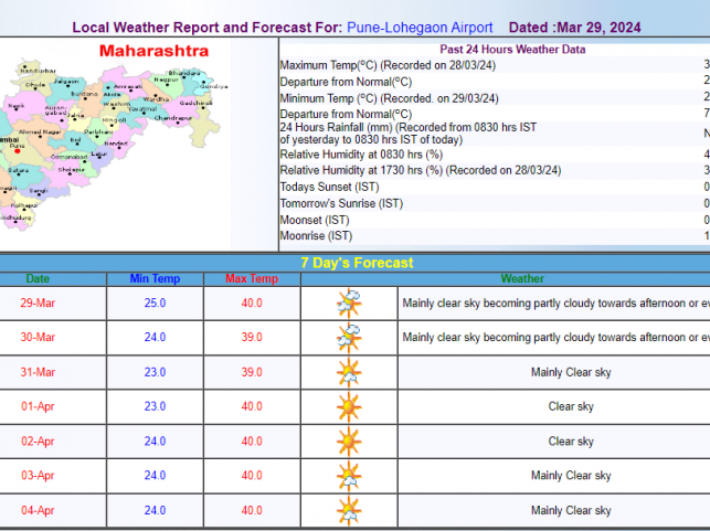 The weather forecast by the Indian Meteorological Department for March 29 to April 04 shows maximum temperature ranging between 40 degrees Celsius to 39 degrees Celsius with the mainly clear sky becoming partly cloudy towards the afternoon or evening on March 29 and March 30 with mainly clear sky for the rest of the days till April 04 in all the five sections in Pune.