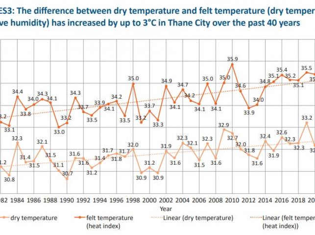 An analysis of the heat index, combining temperature and relative humidity (referred to as felt temperature), reveals a substantial increase in both felt and dry maximum temperatures over the last 40 years (1982–2022) during Thane’s summer months. The average difference between felt and dry temperatures, indicating rising humidity-related temperatures, has slightly increased in recent years. For instance, in 2022, the average summer maximum felt temperatures were nearly 3o C higher than dry temperatures, emphasizing the impact of increased heat stress due to the added humidity factor.