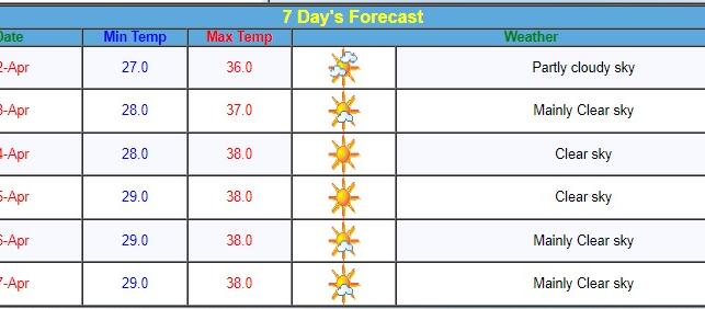 The minimum temperatures will range from 28.0°C on Tuesday and Wednesday to 29.0°C from Thursday through Saturday. The maximum temperatures will hover around 38.0°C from Wednesday through Saturday, with a slightly cooler 37.0°C predicted for Tuesday.