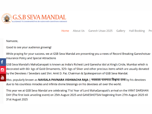 Mumbai is gearing up for the upcoming Ganeshotsav. The 10-day festival begins on August 27. The GSB Seva Mandal’s MahaGanapati is known as India's Richest Lord Ganesha Idol at King's Circle, Mumbai. In the official statement released by them, it was mentioned that the idol of Ganesha will be decorated with 66+ kgs of Gold Ornaments, 325+ kgs of Silver, and other precious items, which are usually donated by the Devotees / sevadars. This year, GSB Seva Mandal is celebrating the 71st year of Lord MahaGanapati’s arrival, with the grand Virat Darshan (first look unveiling) scheduled for 25th August 2025. The Ganeshotsav celebrations will take place from 27th August to 31st August 2025. The devotees can watch the live event on YouTube. (Link: https://www.youtube.com/watch?v=9-zlWldbNgs) The main event will begin at 8 PM.