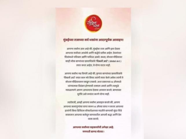 The mandal said, “As we all know that the Raja and other deities of Mumbai are the symbols of our devotion and faith. Images of deities have sanctity and sanctity. Currently, some people on social media are creating 'Ghibli Art' of Bappa's photos, which doesn't seem right. It is a humble request to all of you, please do not create 'Ghibli Art' of Bappa's photographs or those who have created them, remove them from social media. Such an AI app is prone to sarcastic irony and thereby unknowingly insults our God. It is not appropriate to transform Bappa's image like this.”