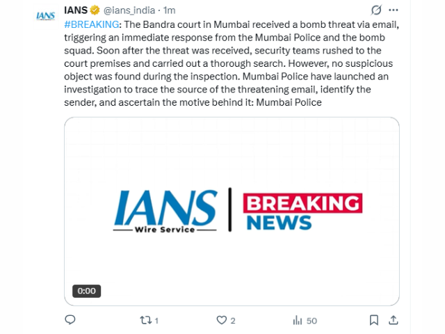 The Bandra Court in Mumbai received a bomb threat email, reported IANS. The threat has triggered an immediate response from the Mumbai Police, and security has been deployed at the court. Mumbai Police and Bomb Squad are present at the spot. As soon as the officials were alerted, the police and bomb squad rushed to the court and carried out a thorough search. However, they have not found anything suspicious during the inspection of the court. Mumbai police has launched a probe and is tracing the source of the threatening email, will look for the identity of the sender, and will investigate the sender's motive behind it.