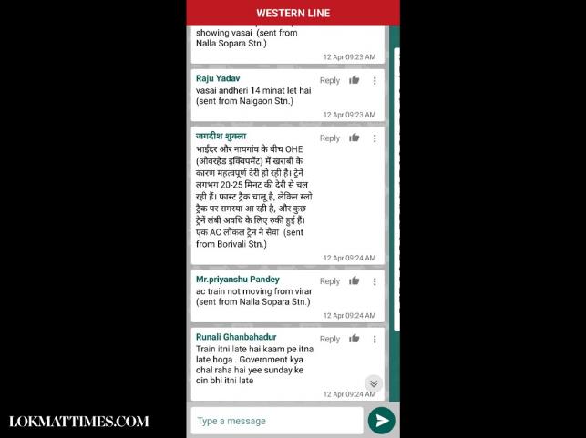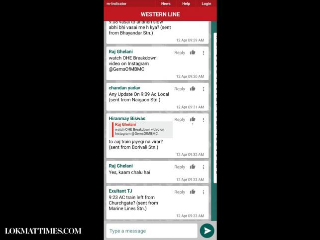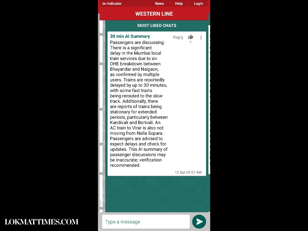 On the M-indicator's train chat section, several commuters were also discussing that the trains were running 20 to 30 minutes late. Commuters stated that there is a significant delay in the Mumbai local train services due to an OHE breakdown between Bhayandar and Naigaon. Trains are reportedly delayed by up to 30 minutes, with some fast trains being rerouted to the slow track. Additionally, there are reports of trains being stationary for extended periods, particularly between Kandivali and Borivali. An AC train to Virar is also not moving from Nalla Sopara.