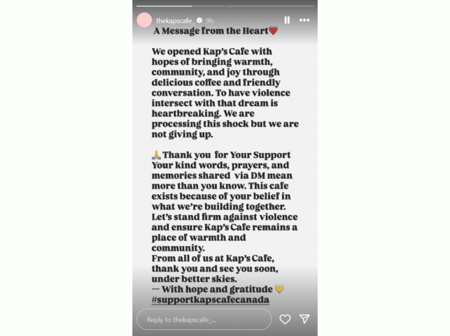 The café team thanked supporters for their messages and encouraged unity against violence. “Let us stand firm against violence and ensure Kap’s Café remains a place of warmth and community. Thank you and see you soon, under better skies,” the post concluded.