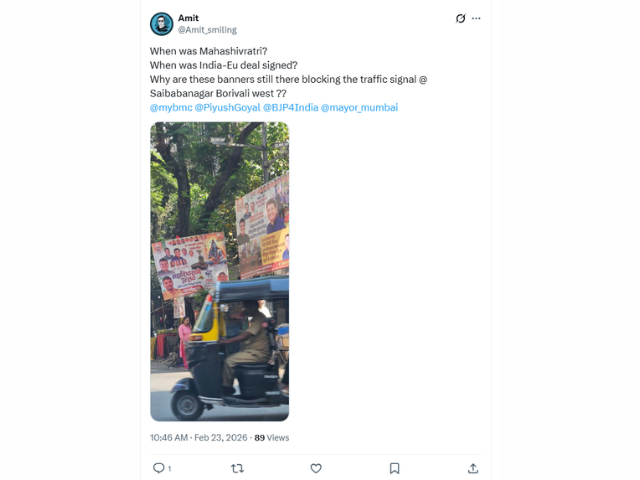In Borivali west posters wishing Maha Shivratri and the India-EU deal were put up by the Bharatiya Janata Party. The Maha Shivratri wishes poster is blocking the signal view of the public, causing motorists inconvenience at Saibabanagar. Taking to X, Mumbaikars complained about it and demanded that the Brihanmumbai Municipal Corporation (BMC) should immediately remove the posters. X users also tagged Mumbai Mayor Ritu Tawde and Union Minister Piyush Goyal in the post, demanding that the banners be removed from the traffic signal. An X user sharing the image of the traffic signal being blocked by the banners wrote on X, "When was Mahashivratri? When was India-Eu deal signed? Why are these banners still there blocking the traffic signal @ Saibabanagar Borivali West?? @mybmc @PiyushGoyal @BJP4India @mayor_mumbai"