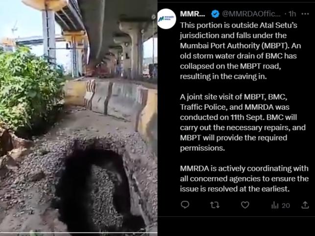 MMRDA responded on Lokmattimes Nagpur, "This portion is outside Atal Setu’s jurisdiction and falls under the Mumbai Port Authority (MBPT). An old storm water drain of BMC has collapsed on the MBPT road, resulting in the caving in. A joint site visit of MBPT, BMC, Traffic Police, and MMRDA was conducted on 11th Sept."