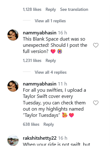 After the clip wnet viral Bhasin also commented, "This Blank Space duet was so unexpected! Should I post the full version?" She further added, "For all you swifties, I upload a Taylor Swift cover every Tuesday, you can check them out on my highlights named “Taylor Tuesdays."