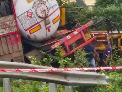 The incident occurred when the tanker was travelling on the slope of the Rahud Ghat on Monday night, and hit the trailer, which was parked on the roadside. At the same time, a car coming from the opposite direction also crashed into the tanker, after which gas leakage began from the tanker.