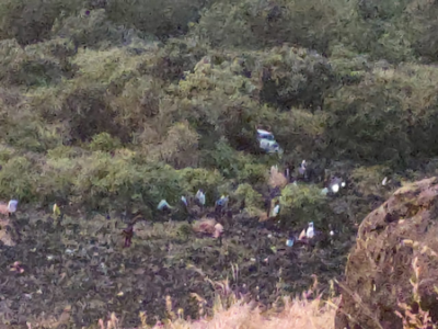 The wreckage lies roughly 800 feet below the road, and teams have been struggling to reach the spot.