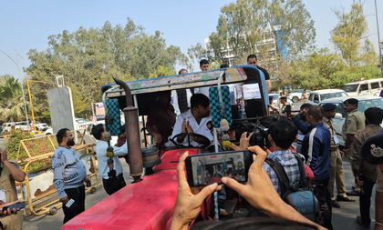 Khava, who represents Jamjodhpur, reached the Assembly premises on a tractor but was stopped at the gate by police and security personnel and was not allowed to enter with the vehicle.