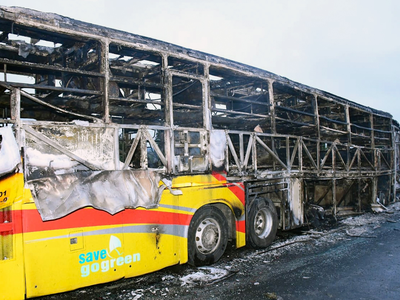 While 19 passengers, including two children, were charred to death, 27 passengers, including both the drivers, escaped by breaking glass windows.
