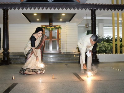 Amaravati, Oct 20 Andhra Pradesh Chief Minister N. Chandrababu Naidu celebrated Diwali with his wife Bhuvaneswari by bursting firecrackers at their house at Undavalli here on Monday night.
