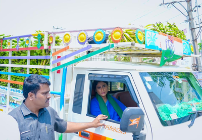 Showing solidarity with banana farmers affected by falling prices, she personally drove the truck loaded with bunched bananas to the Collectorate.