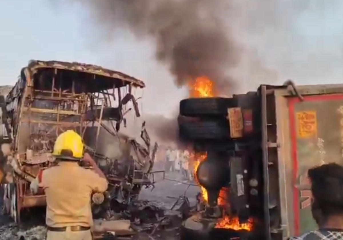 The collision was so severe that the bus was engulfed in flames, resulting in ten passengers on board being burnt alive. The accident took place while the bus was travelling from Nirmal in Telangana to Nellore district in Andhra Pradesh.