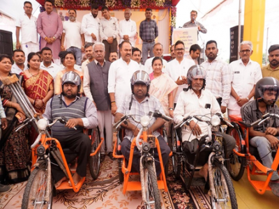 Devices distributed during the Talaja camp included 62 motorised tricycles, 167 tricycles, 40 wheelchairs, 88 crutches, 92 walking sticks, 29 accessible canes, 21 rollators, 53 TLM kits, 46 BTE digital hearing aids, 13 CP chairs, 22 walkers, three Braille kits, 12 smartphones, two ADL kits and 56 artificial limbs manufactured by ALIMCO.