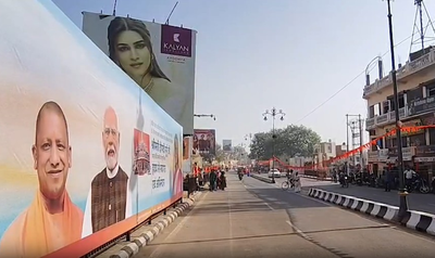 Ayodhya (Uttar Pradesh), March 18 Elaborate arrangements are being made for President Droupadi Murmu's upcoming visit to Ayodhya on March 19. The road leading up to the Ram Janmabhoomi Temple has been adorned with saffron flags and pennant banners. Workers were seen putting up banners across the city, depicting President Murmu, Prime Minister Narendra Modi and Uttar Pradesh Chief Minister Yogi Adityanath.