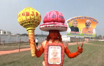 Shravan Shah, a young man from Begusarai, arrives at political gatherings wearing saffron attire, holding a mace in one hand emblazoned with “NaMo BJP.” On his head, he sports an inflatable hat shaped like a lotus, the BJP’s symbol. In his other hand, he carries a banner featuring photographs of Chief Minister Nitish Kumar and Prime Minister Narendra Modi together.