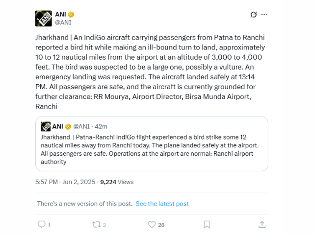 Around 175 passengers had a narrow escape after the IndiGo airplane struck a bird in mid-air. The Patna-Ranchi flight had to make an emergency landing at Ranchi’s Bisra Munda Airport on June 2, an official said, reported ANI. The official further mentioned that all the passengers and crew members were safe. The Airbus 320 suffered damage in this incident. Speaking with the news agency PTI, Director of Birsa Munda Airport, Ranchi, R R Maurya said, "An IndiGo flight suffered a bird hit near Ranchi. It was approximately 10 to 12 nautical miles away from here, at about 3,000 to 4,000 feet altitude, when the incident occurred. The IndiGo flight was coming from Patna to Ranchi, and the pilot had to make an emergency landing here. All the passengers are safe, but the aircraft suffered a dent after being hit by a vulture. Engineers are assessing the damage.”