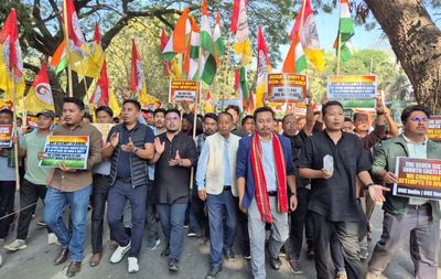 Agartala, Dec 19 The youth wing of the Tipra Motha Party (TMP), an ally of the BJP government in Tripura, on Friday, held a strong protest in front of the Bangladesh Assistant High Commission (AHC) in Agartala, condemning recent remarks by leaders of the neighbouring country allegedly claiming India's Northeast region.