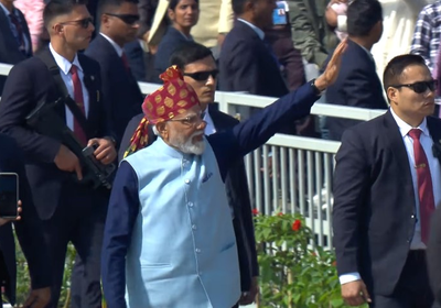 Wearing a red-colored tie-and-dye traditional turban with golden peacock feathers motifs, PM Modi also continued his tradition of making the headgear a hallmark of his Republic Day celebrations.