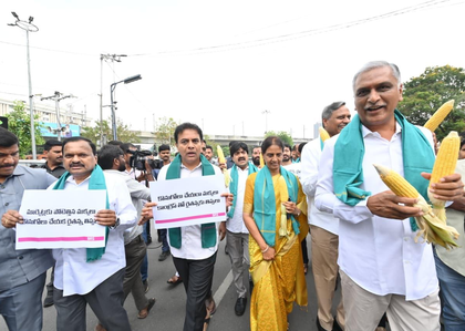 Holding maize cobs in their hands, BRS MLAs and MLCs gathered at Telangana Martyrs’ Memorial Gun Park before marching to the Assembly.