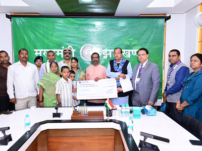 Ranchi, Oct 8 Jharkhand Chief Minister Hemant Soren on Wednesday handed over cheques worth Rs 1.10 crore to the families of two district police personnel -- Sunil Kumar Ram and Santan Kumar Mehta -- who were killed in a Maoist attack in Palamu district.