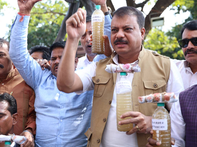 The Congress MLAs held a symbolic demonstration in front of Mahatma Gandhi’s statue within the Assembly premises, carrying bottles filled with murky water and placards.