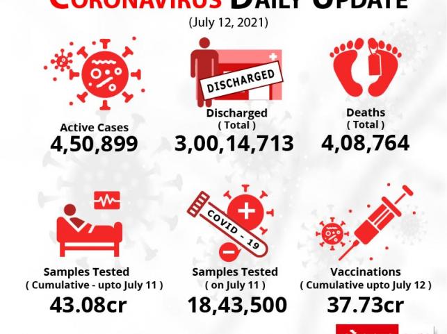 Total COVID-19 deaths in India now stand at 4,08,764 as per July 12 update. The mortality rate is now at 1.32 percent. Total number of tests done on July 11 were 14,32,343. India has vaccinated 37,73,52,501 till now.