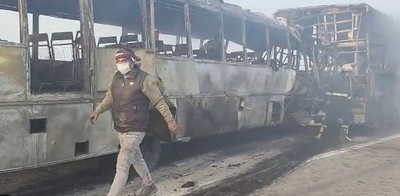 Confirming the development, Mathura District Magistrate Chandra Prakash Singh mentioned that eight buses, including a state-run bus, were completely charred, and two cars were also burned.