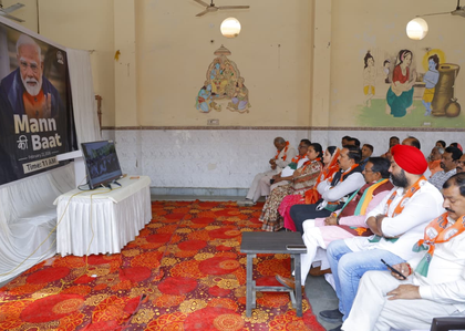 Nangloi legislator Manoj Shokeen and Delhi Convenor of the "Mann Ki Baat" programme Rajan Tiwari listened to the monthly radio programme at the Atal Canteen in Jwalapuri along with Naresh Ahern, local citizens, and BJP workers.