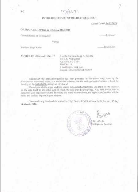 Hyderabad, March 12 The Central Bureau of Investigation (CBI) on Thursday served notice to Telangana Jagruthi leader K. Kavitha in connection with the hearing of the Delhi excise policy case in the Delhi High Court.