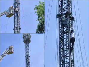 New Delhi, April 24 Delhi Police on Wednesday used a fire brigade crane to bring down two farmers from Tamil Nadu who had climbed a mobile tower while protesting at Jantar Mantar.